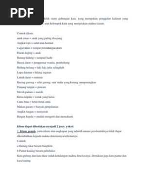 Idiom disebut juga suatu ungkapan berupa gabungan kata yang membentuk makna baru tidak ada hubungan dengan kata pembentuk dasarnya. Idiom atau disebut juga dengan ungkapan adalah gabungan kata yang membentuk arti baru dimana tidak berhubungan dengan kata pembentuk dasarnya. Dalam perbendaharan bahasa indonesia ada beberapa susunan kalimat yang digunakan untuk. Peribahasa adalah kelompok kata atau kalimat yang tetap susunannya dan biasanya mengisahkan suatu maksud tertentu.