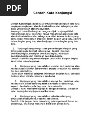 Contoh irisannya adalah karena sesudah sejak sebelum. Konjungsi atau bisa disebut kata sambung yaitu merupakan kata untuk menghubungkan kata kata ungkapan ungkapan atau kalimat kalimat dan sebagainya dan tidak juga untuk tujuan atau maksud lain. Dalam kaitannya dengan perangkaian dengan penghubung antarkalimat kata di mana yang merupakan penerjemahan langsung dari bahasa inggris where juga menampakkan pengaruhnya. Konjungsi tak dihubungkan dengan objek konjungsi tidak menerangkan kata konjungsi ada hanya menghubungkan kalimat kalimat atau kata kata dan sebagainya.
