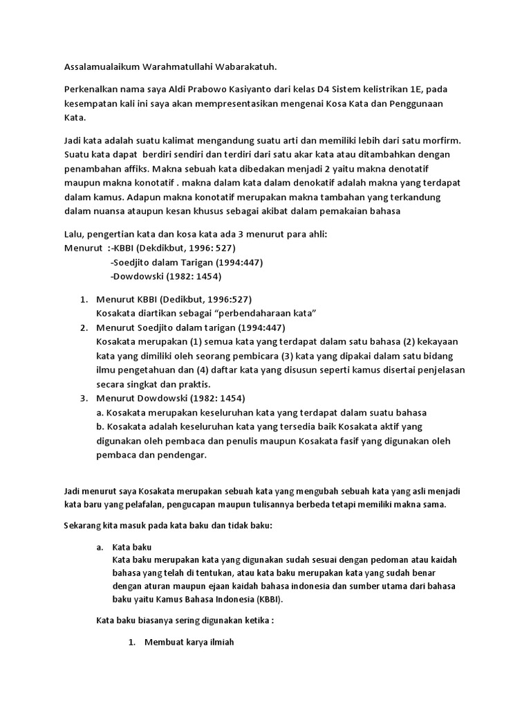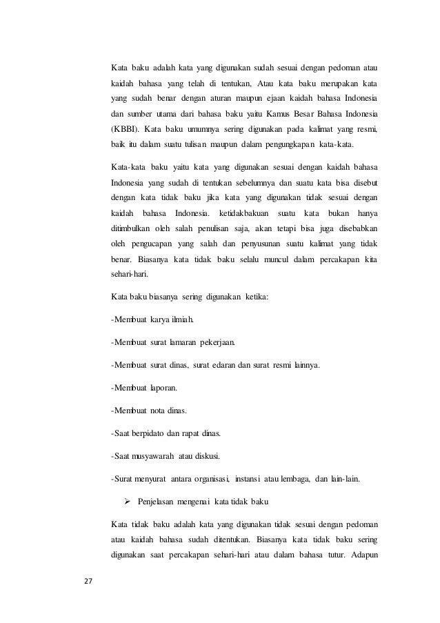 Kata baku adalah kata yang digunakan sudah sesuai dengan kaidah bahasa yang telah ditentukan yaitu. Kata baku adalah kata yang digunakan telah sesuai dengan pedoman atau kaidah bahasa yang telah di tentukan atau kata baku merupakan kata yang telah benar dengan keputusan maupun ejaan kaidah bahasa indonesia dan sumber utama dari bahasa baku yaitu kamus besar bahasa indonesia kbbi. Bahasa baku atau yang kerap disebut sebagai bahasa standar atau bahasa formal merupakan bahasa yang sesuai dengan pedoman umum ejaan bahasa indonesia puebi. Kata baku adalah kata kata yang penulisannya sudah ditetapkan secara resmi lewat surat putusan pejabat pemerintah maklumat ataupun kata yang telah diterima berdasarkan kesepakatan umum. Kata baku sebenanya merupakan kata yang digunakan sesuai dengan kaidah bahasa indonesia yang telah ditentukan.