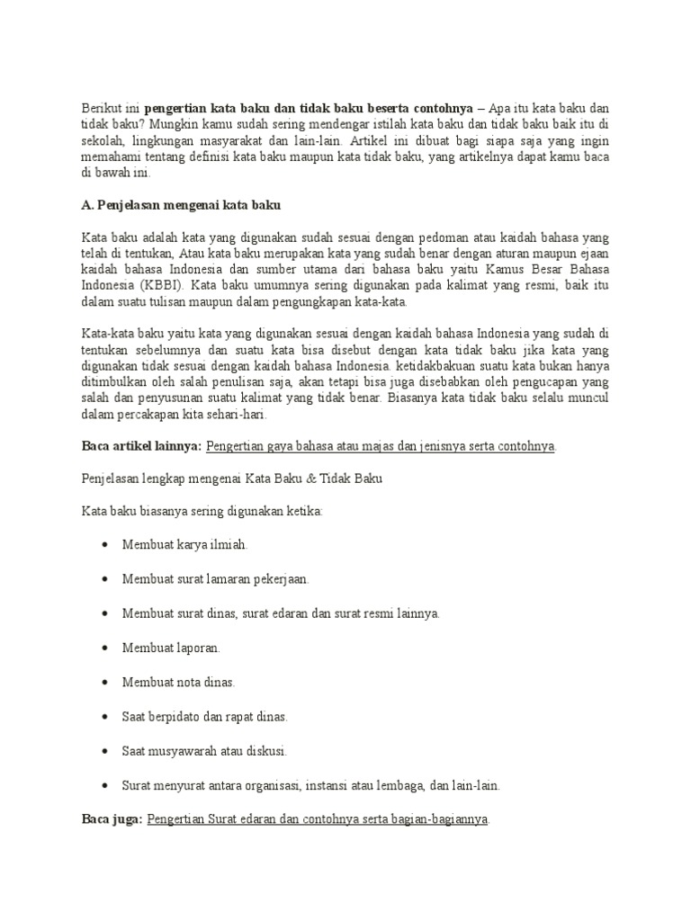 Kata baku merupakan sebuah kata yang digunakan sudah sesuai dengan pedoman atau kaidah bahasa yang sudah di tentukan atau kata baku adalah kata yang sudah benar dengan aturan maupun ejaan kaidah bahasa indonesia dan sumber utama dari bahasa baku yakni kamus besar bahasa indonesia kbbi.