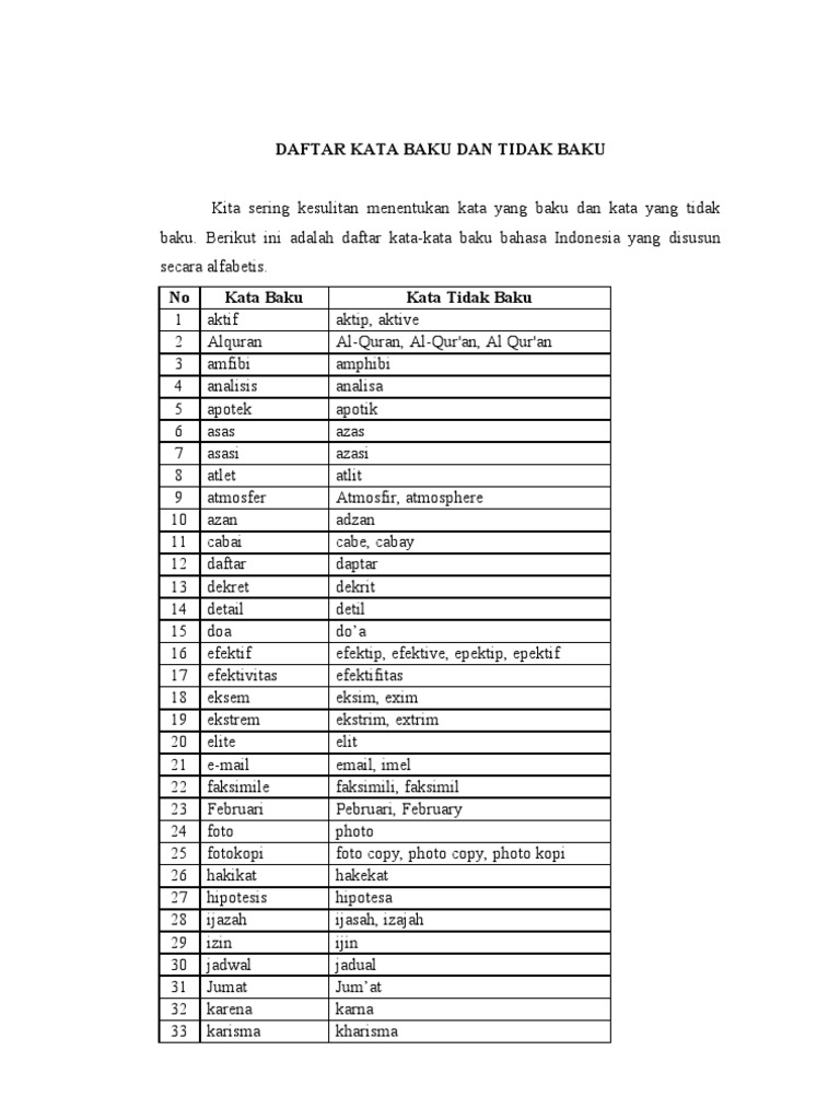 Dalam konteks bahasa indonesia kata baku adalah kata yang sesuai dengan kaidah bahasa indonesia dan ejaannya sesuai dengan apa yang ada dalam kamus besar bahasa indonesia kbbi. Dengan mengetahui perbedaan antara kata baku dan tidak baku bisa memberikan banyak manfaat kepada kita terutama bagi kamu yang bekerja di bidang pendidikan kajian. Jadi bila ingin menggunakan kata yang sesuai eyd atau aturan baku maka gunakanlah kata sistem bukan sistim. Kata yang terdapat dalam kbbi adalah risiko.