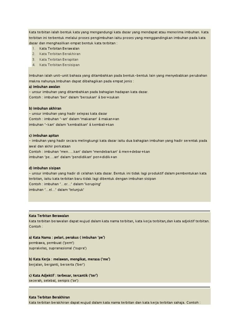 Bentuk kata yang mengandungi kata dasar yang mendapat atau menerima baik awalan sisipan akhiran atau apitan imbuhan imbuhan ialah bentuk morfem yang tidak boleh hadir bersendirian dalam ayat dan harus diimbuhkan pada bentuk yang lain yang merupakan kata dasar. Untuk kata dasar yang diawali dengan r maka awalan ber menjadi be per menjadi pe.
