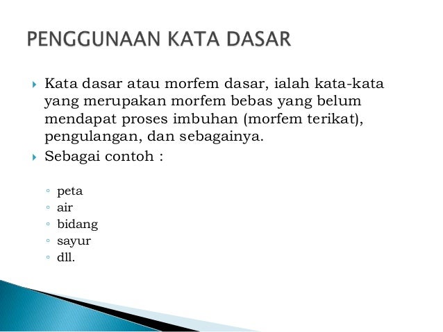 Jadi kata dasar merupakan kata yang menjadi dasar pembentukan suatu kata yang baru yang lebih luas dan mungkin menjadikan kata tersebut memiliki makna yang berbeda. Imbuhan imbuhan ini ditambah kepada kata dasar untuk menghasilkan kata terbitan kata nama kata kerja kata adjektif kata keterangan dan kata bilangan. Kata utama adalah unit terkecil dalam bahasa yang penting. Imbuhan man termasuk imbuhan yang improduktif artinya penggunaannya terbatas hanya kata seniman dan budiman.