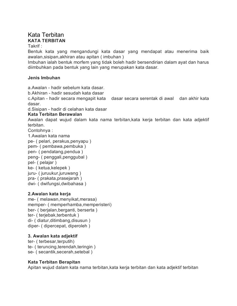 Kata dasar yang mendapat imbuhan. Imbuhan dapat dibahagikan kepada beberapa kumpulan seperti yang berikut. Kata dasar adalah kata yang belum mendapat imbuhan baik itu berupa awalan atau prefiks sisipan konfiks maupun akhiran atau sufiks. Sedangkan kata dasar primernya sambung mendapat sisipan in yang artinya menyatakan sifat terus menerus. Imbuhan adalah bubuhan yang berupa awalan sisipan dan akhiran pada kata dasar untuk membentuk sebuah kata baru.
