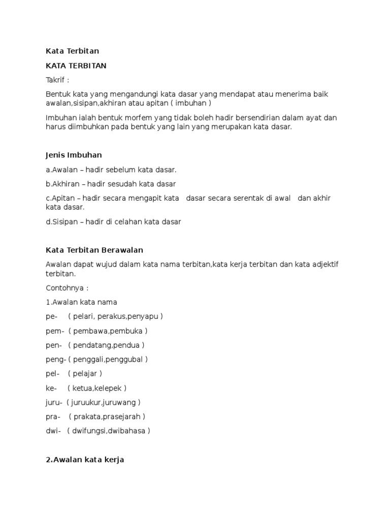 Kata berimbuhan adalah kata dasar yang telah mendapatkan imbuhan baik awalan sisipan akhiran maupun gabungan imbuhan. Kata dasar merupakan suatu kata yang utuh dan belum mendapat imbuhan apa pun. Sedangkan kata dasar primernya sambung mendapat sisipan in yang artinya menyatakan sifat terus menerus. Untuk membentuk kata kerja tak transitif daripada kata kata lain.