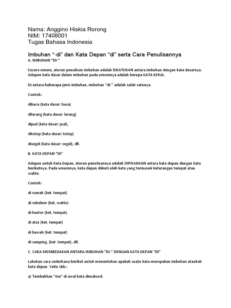 Sebagai prefiks awalan tuliskan serangkai. Maksudnya gabungan kata yang terbentuk dari kata dasar dan kata bentuk terikat seperti adi multi atau sejenisnya harus dituliskan secara serangkai. Aku lahir dan besar di. Berikut ini terdapat beberapa aturan penulisan kata depan preposisi terdiri atas.