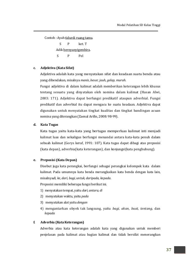 Kata depan atau disebut juga dengan preposisi adalah kata yang secara sintaksis tata susunan kalimat terletak di depan kata benda nomina kata sifat adjektiva dan kata keterangan adverbia sedangkan secara semantis makna kata depan menandai berbagai hubungan makna antara konstituen yang terletak di depan dan di belakang kata depan tersebut. Konjungsi koordinatif adalah konjungsi yang menghubungkan 2 unsur atau lebih dan kedua unsur itu memiliki status sintaksis yang sama. Kata depan atau preposisi menandai hubungan makna antara kata yang berada di depan dan di belakang preposisi tersebut. Shinta menangis hingga suranya menjadi serak.