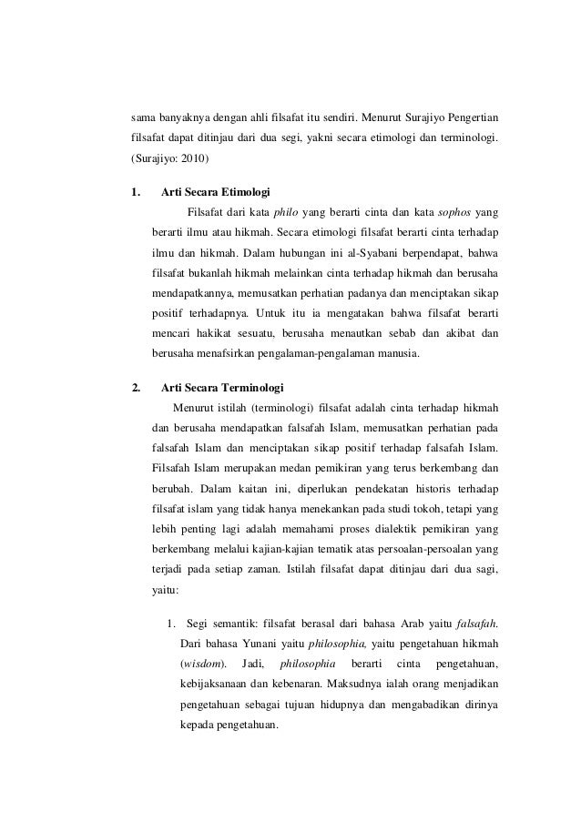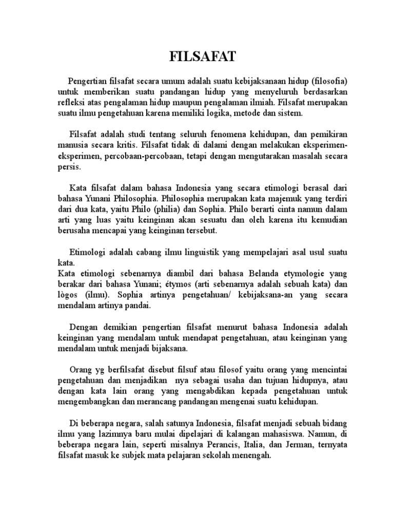Dengan demikian filsafat dapat diartikan sebagai. Berdasarkan etimologinya kata filsafat dalam bahasa indonesia berasal dari bahasa yunani philosophia yang terdiri dari dua kata yaitu philein mencintai atau philia cinta atau philos sahabat kekasih dan sophia kebijaksanaan kearifan. Kata falsafah atau filsafat dalam bahasa indonesia merupakan kata serapan dari bahasa arab فلسفة yang juga diambil dari bahasa yunani. φιλοσοφία philosophia dalam bahasa ini kata ini merupakan kata majemuk dan berasal dari kata kata philia persahabatan cinta dsb dan sophia kebijaksanaan kearifan butuh rujukan sehingga arti harafiahnya adalah.
