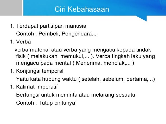 Ciri kaidah kebahasaan teks prosedur kompleks yaitu. Teks prosedur dalam membuat atau menjalankan suatu kegiatan sistematis diperlukan suatu teks berisikan tentang penjelasan urutan urutan yang harus dilakukan yaitu disebut dengan teks prosedur. Kalimat dalam teks prosedur berbeda dengan kalimat dalam teks deskriptif maupun teks lainnya. Kalimat imperatif yaitu kata yang mengandung perintah atau larangan ketika melakukan pelaksanaan yang dibahas.